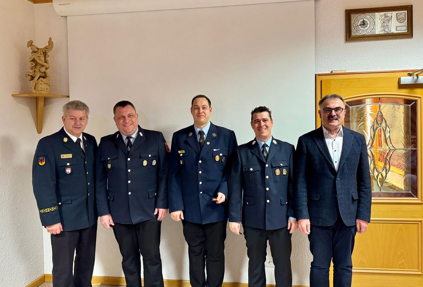 (von links: KBI Steffen Kiesel, KDT a.D. Christoph Hillenbrand, 2.KDT Sebastian Fell, 1.KDT Julian May, BGM Harald Hofmann)